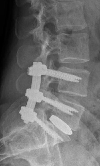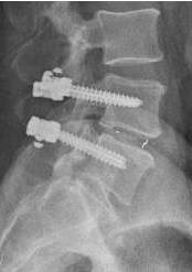 In una artrodesi postero-laterale ci si avvale dell'impianto di barre e viti peduncolari in associazione ad innesto di osso autologo (fig.8), per ottenere una secondaria "artrodesi" fisiologica (ossia una fusione ossea), potendo anche prevedere la stabilizzazione di più spazi contigui.